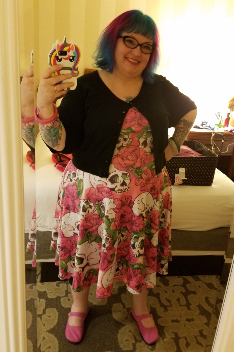20180412_234822 Previous Next Published April 20, 2018 at 2327 × 3488 in 10 Things I Loved About #18NTC My dress with white skulls and pink flowers with a black sweater.